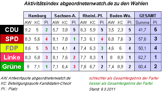 Vorgehensweise: In den Aktivitätsindex ist neben der Antwortquote auch die Beteiligungsquote am Kandidaten-Check eingeflossen, den wir in allen vier Bundesländern anbieten (bzw. im Fall von Hamburg angeboten haben). Beim Kandidaten-Check können Wähler - ähnlich wie beim Wahl-O-Mat - ihre Positionen mit denen ihrer Wahlkreiskandidaten abgleichen. Hierzu haben wir vor dem Start des Kandidaten-Check alle Kandidierenden mehrmals angeschrieben und auf die Möglichkeit zur kostenlosen Teilnahme hingewiesen (hier gehts zum Kandidaten-Check in Baden-Württemberg, in Rheinland-Pfalz, in Sachsen-Anhalt). Der besseren Vergleichbarkeit wegen haben wir aus den Prozentwerten einstellige und gerundete Indexwerte gebildet. Aus einer Antwortquote von 76,4 Prozent wurde der Wert 7,6. Um ein Gesamtergebnis aus allen vier Landtagswahlen zu erhalten, haben wir die einzelnen Indexwerte einer Partei addiert. Da von allen Parteien nur CDU, SPD, FDP, Grüne und Linke in sämtlichen Wahlkreisen antreten, haben wir nur diese Parteien berücksichtigt. Eine Partei mit fünf oder zehn Kandidaten ist bei Antwort- und Beteiligungsquote nicht vergleichbar mit einer Partei, bei der 60 oder 70 Kandidierende zur Wahl stehen. Die Antwortquoten aller Parteien, die mit eigenen Direktkandidaten antreten, können aber auf der jeweiligen Wahlprotalseite in der rechten Spalte eingesehen werden (Beispiel Baden-Württemberg)