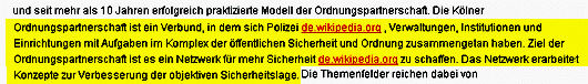 Auf abgeordnetenwatch.de hat der damalige OB-Kandidat Roters im Wahlkampf 2009 Fragen von Bürgern beantwortet, etwa zum Thema „Freiheit und Bürgerrechte“. Dabei verweist Roters auf die Kölner „Ordnungspartnerschaft“ zwischen Stadtverwaltung und Polizei. Reyher behauptet, dass Roters die Beschreibung der Ordnungspartnerschaft bei Wikipedia abgeschrieben hat. Ein Skandal. Muss der OB jetzt zurücktreten? Nein, muss er nicht! Roters dreht den Spieß einfach um: „Sollte etwa Wikipedia es versäumt haben, die Quelle dieser Definition, wie sie in Fachgremien entwickelt wurde, anzugeben?“, fragt der OB. Wohl zu Recht. Denn er hat Ende der 90er Jahre als Polizeipräsident die „Ordnungspartnerschaft“ selbst entwickelt. Und demzufolge bei sich selbst abgeschrieben…