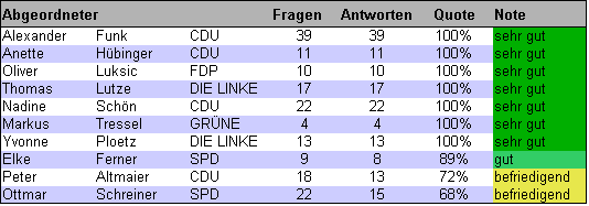 Um diejenigen Abgeordneten nicht zu benachteiligen, die erst vor kurzem eine Frage erhalten haben, wurden nur Fragen berücksichtigt, die vor dem 6. Juni 2011 gestellt wurden. In die Statistik eingeflossen sind alle Antworten, die bis vergangenen Montag (20.6.2011) vorlagen. Antworten mit standardisierten Texten, sog. “Standardantworten”, wurden als keine Antwort gezählt. Bewertungsrahmen: sehr gut: 100 – 90%, gut: 89 – 80%, befriedigend: 79 – 65%, ausreichend: 64 – 50%, mangelhaft: 49 – 1%, ungenügend: 0%. In den kommenden Wochen werden wir die Antwortquoten der Bundestagsabgeordneten aus anderen Bundesländern ebenfalls hier im Blog veröffentlichen.
