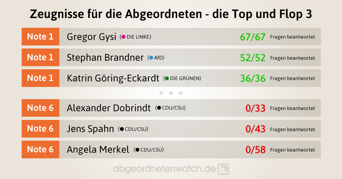 Die letzten zehn Plätze belegen insgesamt gleich fünf Abgeordnete von CDU/CSU, drei von der SPD sowie je eine*r von Grünen und Linken. Bei der AfD hat Alice Weidel die meisten Bürgerfragen unbeantwortet gelassen (insgesamt 13), bei der FDP ist es Alexander Graf Lambsdorff (vier unbeantwortete Fragen). Von den 709 Bundestagsabgeordneten reagierten 173 auf keine der an sie gestellten Fragen, insgesamt 659 mal blieb eine Antwort aus.