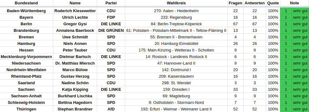 Von den Abgeordneten von CDU/CSU, SPD und den Grünen wurden über 80% bereits befragt. AfD und die Linke kommen auf 79% bzw. 75%. Von den FDP-Abgeordneten wollten die Bürgerinnen und Bürger am wenigsten wissen: Erst 55 der 80 FDP-Abgeordneten (69%) erreichte mindestens eine Frage.