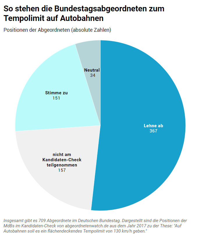 Mehr als die Hälfte der Bundestagsabgeordneten sind gegen die Einführung eines Tempolimits von 130 km/h auf deutschen Autobahnen (mind. 367 der insgesamt 709 MdBs). Dies geht aus Angaben der Parlamentarierinnen und Parlamentarier hervor, die diese im Kandidaten-Check von abgeordnetenwatch.de zur Bundestagswahl 2017 gemacht haben. Die Abgeordneten äußerten sich damals zu der folgenden These: