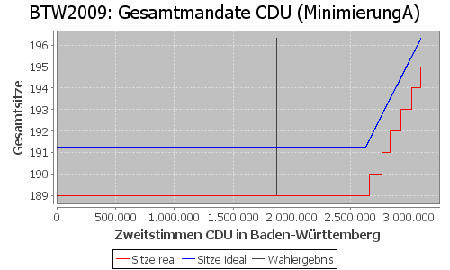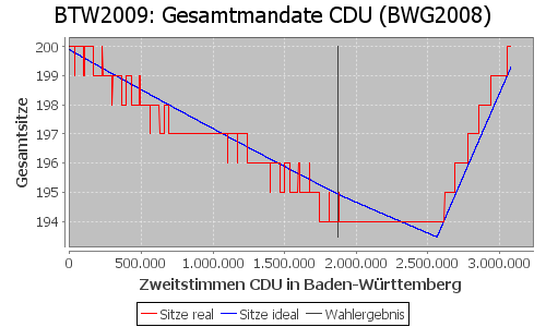 Man kann das negative Stimmgewicht grafisch darstellen, indem man die Anzahl der Sitze einer Partei auf die Zweitstimmenzahl einer Landesliste aufträgt und dabei die Ergebnisse aller anderen Landeslisten und die Wahlkreisgewinne gleich lässt. Im Beispiel (rote treppenförmige Kurve) für die Bundestagswahl 2009 die Anzahl der Sitze der CDU in Abhängigkeit ihrer Zweitstimmenzahl in Baden-Württemberg.