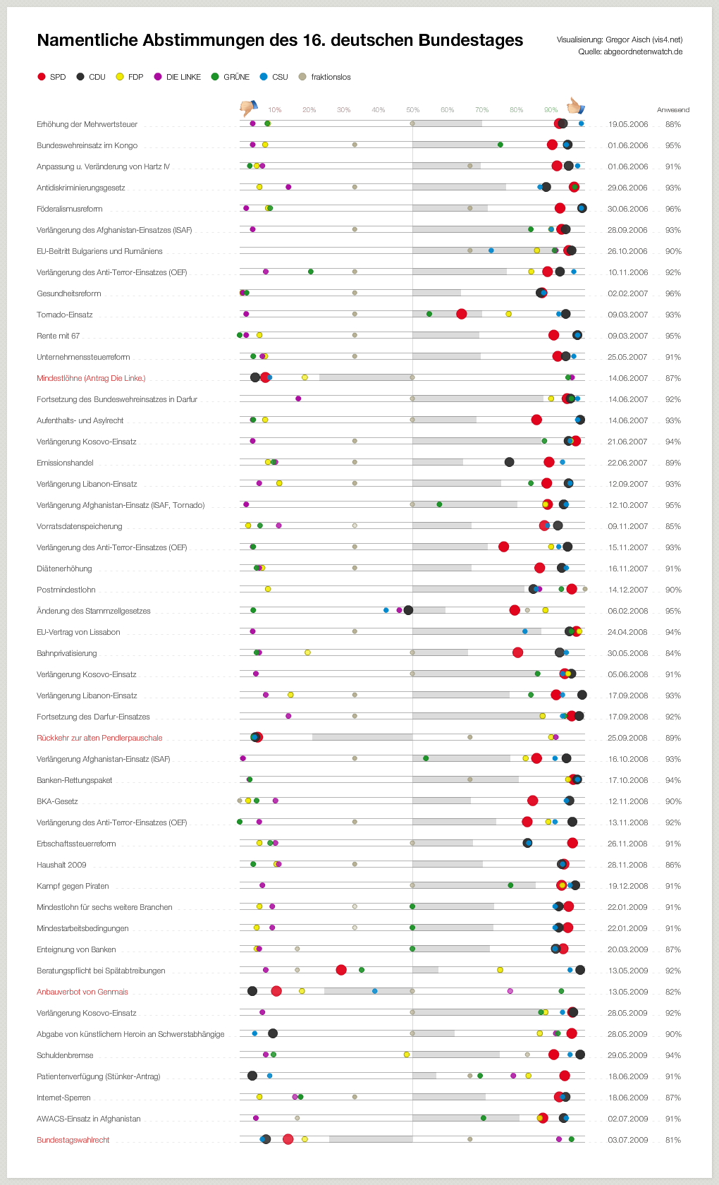 Hinweise: 1. Dargestellt sind in den Grafiken die Zustimmungsraten bei allen von abgeordnetenwatch.de dokumentierten namentlichen Abstimmungen zwischen 2005 und 2010. 2. Die farbigen Punkte stellen die einzelnen Parteien dar. Ihre Größe ist proportional zur Anzahl der gewählten Abgeordneten, um auch optische die Gewichtung der Partei im Bundestag anzudeuten. 3. An den horizontalen grauen Balken lässt sich die Gesamtzustimmung des Bundestags zu jeder Abstimmung ablesen. 4. Eine beschriftete Großansicht erhalten Sie durch Anklicken der jeweiligen Grafik.