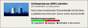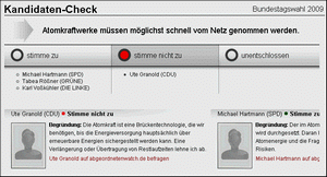 Dokumentiert sind die Positionen unserer Politiker zur Atomkraft darüber hinaus im Kandidaten-Check, den wir zur Bundestagswahl 2009 in Kooperation mit SPIEGEL ONLINE erstmals angeboten haben. Damals stimmten 949 der 1.419 teilnehmenden Kandidaten (67 Prozent) der These zu, dass Atomkraftwerke "möglichst schnell vom Netz genommen werden" müssen. 404 Politiker waren gegensätzlicher Meinung, 66 unentschlossen. Auch das Abstimmungsverhalten der Abgeordneten am 28. Oktober 2010, als es im Bundestag um die Verlängerung der AKW-Laufzeiten ging, haben wir auf abgeordnetenwatch.de dokumentiert. Dabei zeigte sich, dass nicht alle Politiker ihre Wahlversprechen eingehalten haben. So schrieb etwa die Kandidatin Ute Granold vor der Wahl, dass sie