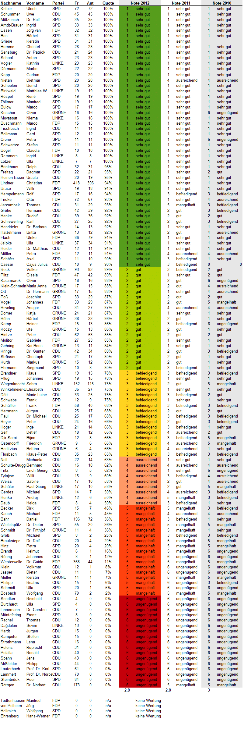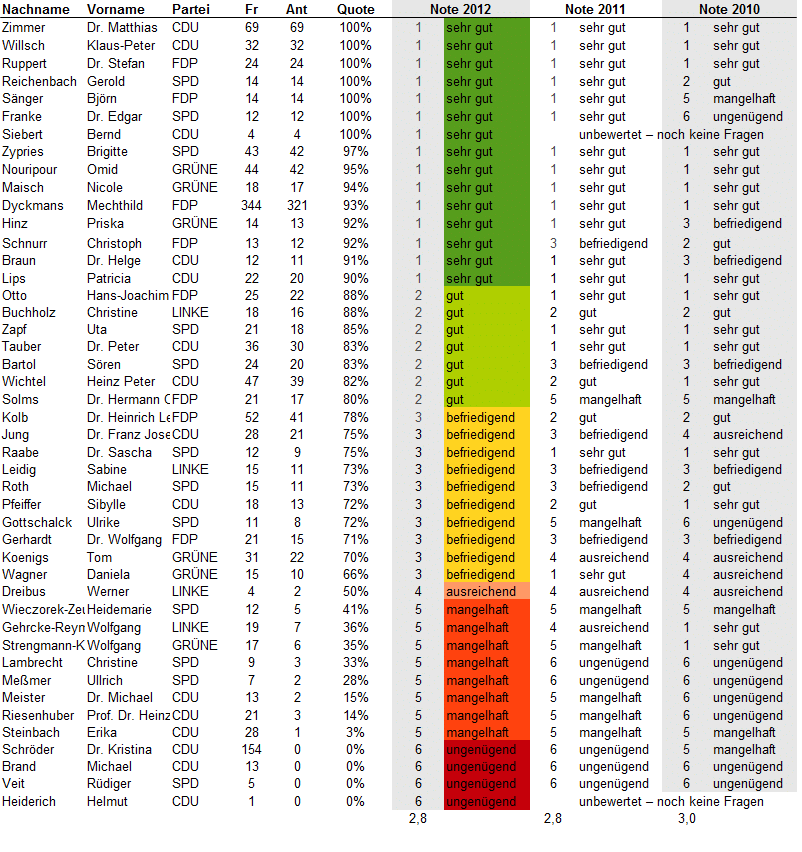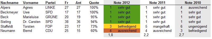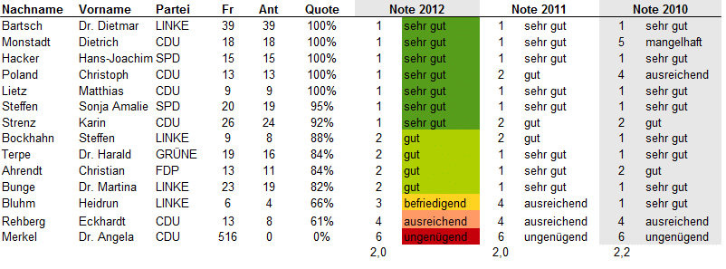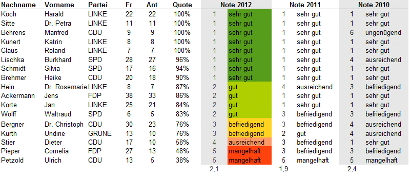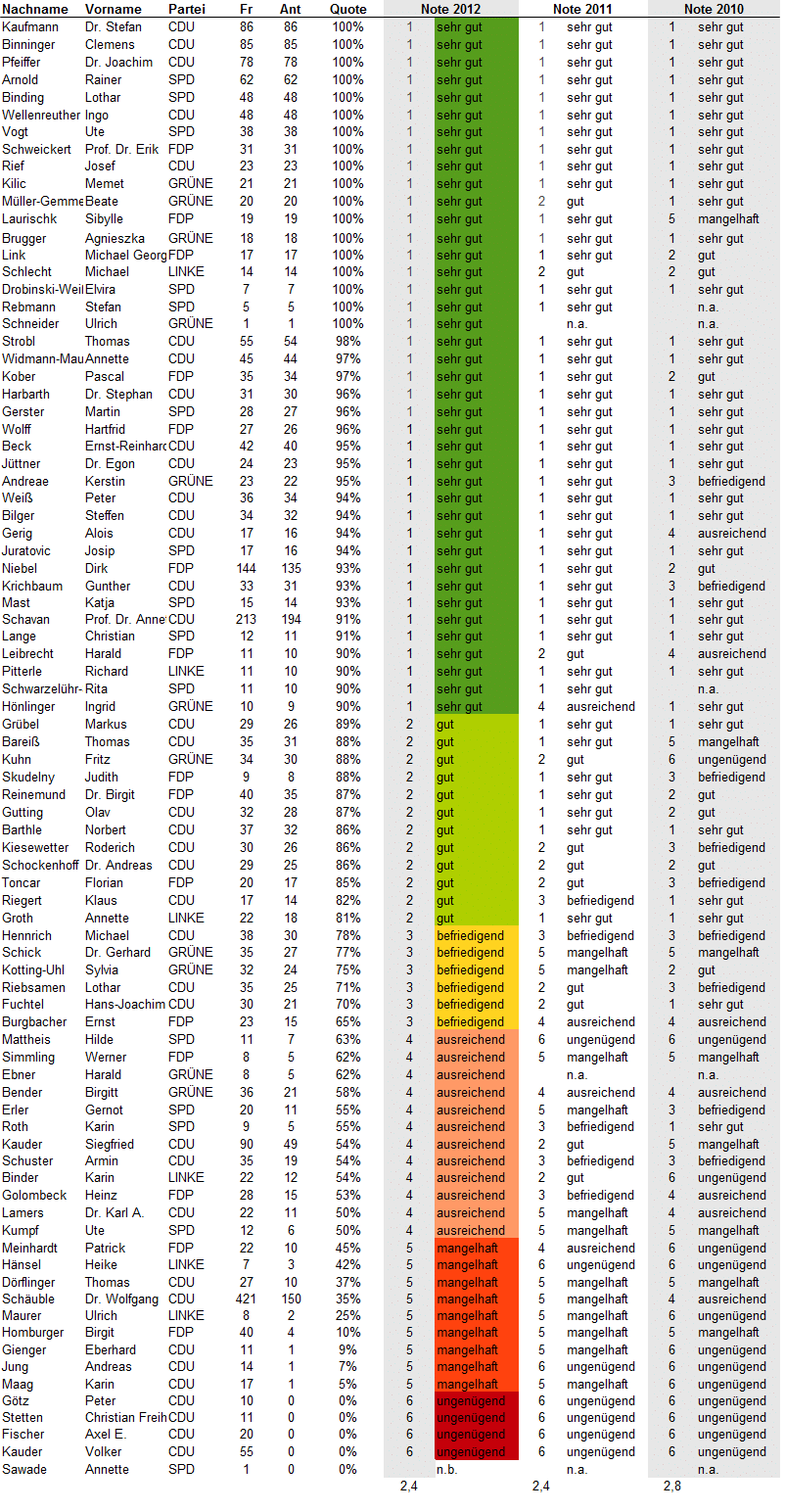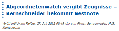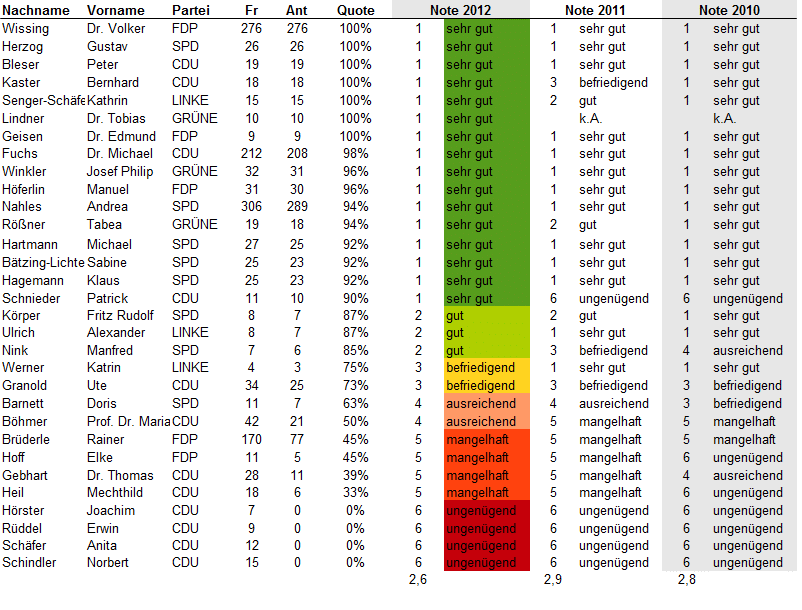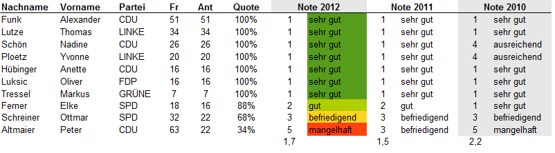 Update 25.7.2012: Bei Twitter oder über ihre Lokalmedien haben sich einige Abgeordneten zu ihren Noten geäußert. Eine Auswahl:
