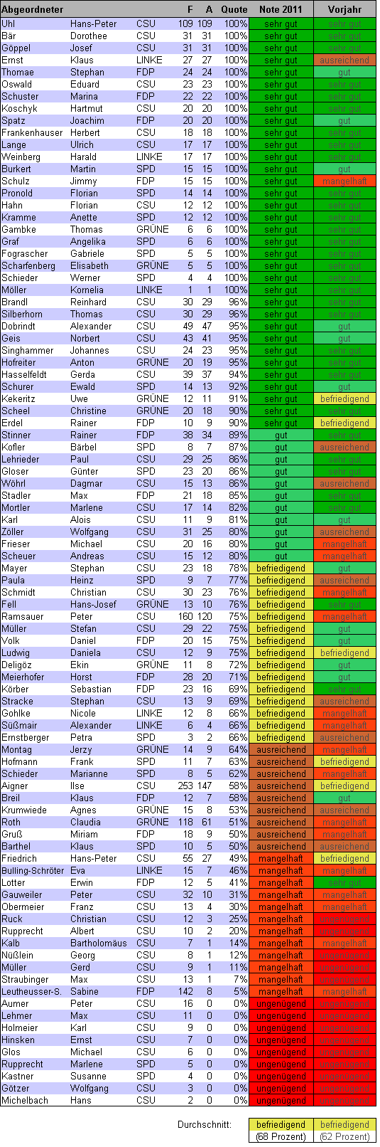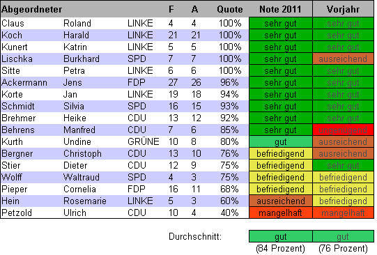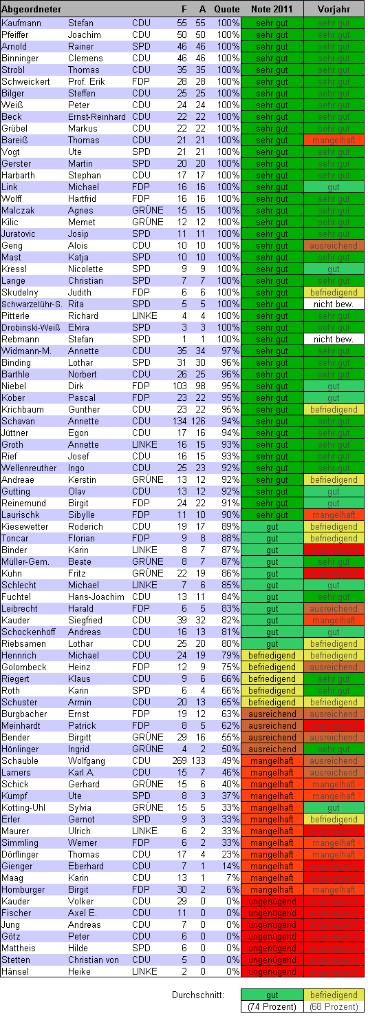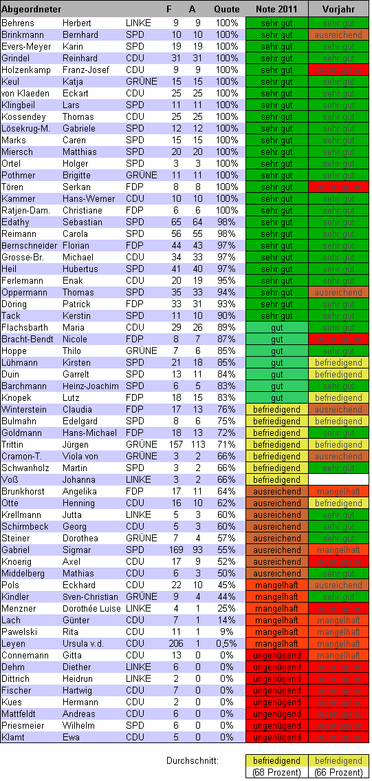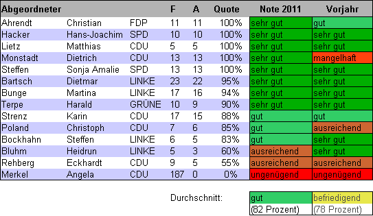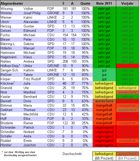 Um diejenigen Abgeordneten nicht zu benachteiligen, die erst vor kurzem eine Frage erhalten haben, wurden nur Fragen berücksichtigt, die bis 14 Tage vor Veröffentlichung der Zeugnisnoten gestellt wurden (im Fall des Saarlands war dies bspw. der 6. Juni 2011). In die Statistik eingeflossen sind alle Antworten, die bis zum Redaktionsschluss vorlagen (Bsp. Saarland: 20. Juni). Antworten mit standardisierten Texten, sog. “Standardantworten”, wurden als keine Antwort gezählt. Bewertungsrahmen: sehr gut: 100 – 90%, gut: 89 – 80%, efriedigend: 79 – 65%, ausreichend: 64 – 50%, mangelhaft: 49 – 1%, ungenügend: 0%. ("Nicht bew.": Bei diesen Abgeordneten handelt es sich um Nachrücker, die im vergangenen Jahre noch nicht im Bundestag saßen und deswegen nicht bewertet werden konnten.)
