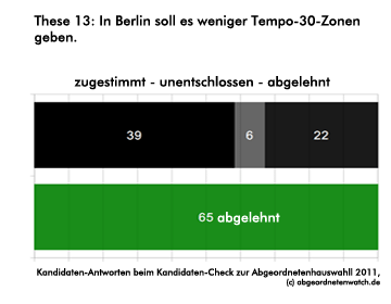 Tempo 30: Kandidaten-Check-These: In Berlin soll es weniger Tempo-30-Zonen geben. Für die Grünen ist die Sache klar: Sämtliche Kandidierenden widersprechen dieser These. Innerhalb der CDU ist das Thema umstritten: Gut die Hälfte spricht sich zwar gegen Tempo-30-Zonen aus, jeder Dritte Kandidat liegt hier aber mit den Grünen auf einer Wellenlänge.
