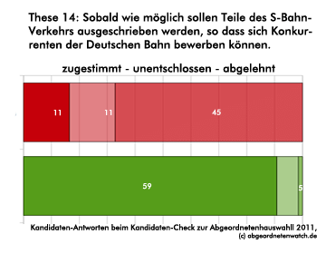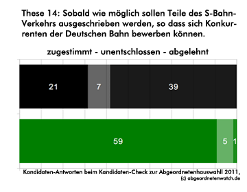 Ausschreibung bei der S-Bahn Kandidaten-Check-These: Sobald wie möglich sollen Teile des S-Bahn-Verkehrs ausgeschrieben werden, so dass sich Konkurrenten der Deutschen Bahn bewerben können. Während die Grünen sich beinahe geschlossen für eine Ausschreibung bei der S-Bahn aussprechen, sind zwei Drittel der SPD-Kandidaten dagegen.