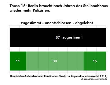 Mehr Polizei: Kandidaten-Check-These: Berlin braucht nach Jahren des Stellenabbaus wieder mehr Polizisten. Auffallend ist die große Gruppe der Unentschlossenen unter den Grünen-Direktkandidaten (knapp zwei Drittel). Die CDU ist geschlossen für die Personalaufstockung bei der Polizei.
