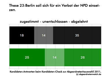 NPD-Verbot: Kandidaten-Check-These: Berlin soll sich für ein Verbot der NPD einsetzen. Beide Parteien sind in dieser Frage gespalten. Sowohl bei der CDU als auch bei den Grünen spricht sich die größte Gruppe gegen ein neuerliches Verbotsverfahren aus, allerdings ist auch die Zahl der Unentschlossenen äußerst groß.