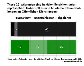 Migrantenquote: Kandidaten-Check-These: Migranten sind in vielen Bereichen unterrepräsentiert. Daher soll es eine Quote bei Neueinstellungen im Öffentlichen Dienst geben. Die große Mehrheit der CDU-Direktkandidaten ist sich in diesem Punkt einig: Eine Migrantenquote soll es nicht geben. Auch unter den Grünen-Kandidaten spricht sich die größte Gruppe gegen eine solche Quotierung aus, mehr als jeder Vierte ist unentschlossen.