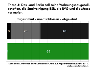 Privatisierungen: Kandidaten-Check-These: Das Land Berlin soll seine Wohnungsbaugesellschaften, die Stadtreinigung BSR, die BVG und die Messe verkaufen. Die Direktkandidaten beider Parteien sind zwar mehrheitlich gegen die Privatisierung städtischer Beteiligungen. Doch während die Grünen den Verkauf beinahe geschlossen ablehnen, sind es unter den CDU-Kandidaten nur etwas mehr als die Hälfte. Mehr als ein Drittel ist in dieser Frage allerdings noch unentschlossen. Update 14.09.2011: Dieser Absatz wurde nach Hinweisen aufmerksamer Leser korrigiert, so dass es nun richtig heißt, dass die Grünen und die meisten Kandidaten der CDU die Privatisierung ablehnen und nicht wie zuvor versehentlich beschrieben befürworten würden. Wir bitten diesen Fehler zu entschuldigen.
