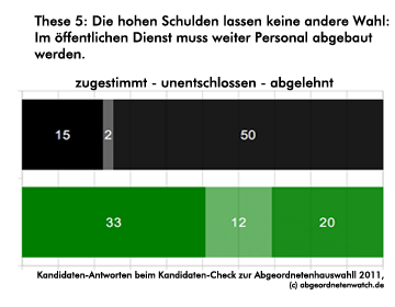 Personalabbau im öffentlichen Dienst: Kandidaten-Check-These: Die hohen Schulden lassen keine andere Wahl: Im öffentlichen Dienst muss weiter Personal abgebaut werden. Etwa die Hälfte der Grünen-Kandidaten befürwortet zwar den Personalabbau, der von den CDU-Politikern mehrheitlich abgelehnt wird. Umgekehrt bedeutet dies jedoch: Die übrigen Direktkandidaten der Ökopartei teilen die Position der CDU-Kollegen oder sind in dieser Frage noch unentschlossen. Auch innerhalb der CDU ist das Thema Personaleinsparung nicht unumstritten. Jeder fünfte Christdemokrat ist dafür. Die große Gruppe der Grünen-Kandidaten, die sich für einen Personalabbau im öffentlichen Dienst ausspricht, stellt sich damit übrigens gegen das eigene Wahlprogramm Darin heißt es auf Seite 91 unmissverständlich: