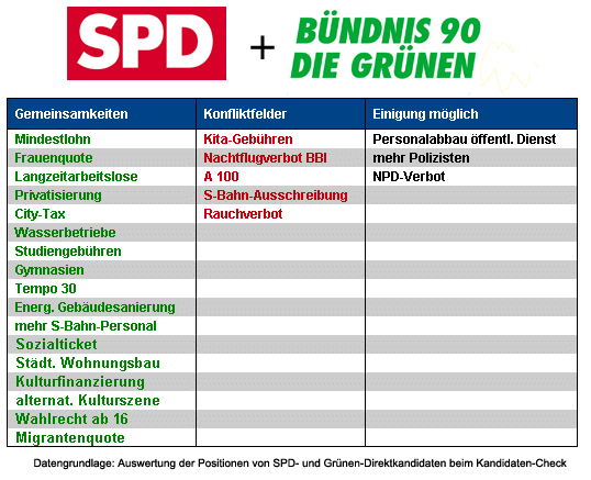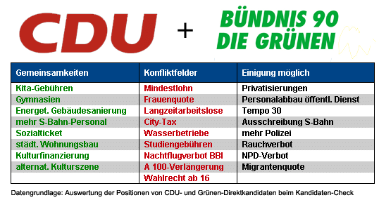 Konfliktstoff dürfte es reichlich geben, sollten sich CDU und Grüne bei Koalitionsverhandlungen gegenübersitzen. Angefangen beim Nachtflugverbot für den Flughafen BBI, über den Rückkauf der Wasserbetriebe bis hin zur Finanzierung von Arbeitsplätzen für Langzeitarbeitslose. Bei etwa einem Drittel der im Kandidaten-Check abgefragten Themen nehmen die Direktkandidaten von CDU und Grünen vollkommen gegensätzliche Positionen ein. Doch ebenso lang ist die Liste der Gemeinsamkeiten: Einigkeit herrscht u.a. bezüglich der Beibehaltung von Gymnasien, beim städtischen Wohnungsbau und der Förderung der alternativen Kulturszene. Schwarz und Grün stimmt sogar bei der Frage überein, ob die letzten beiden Kita-Jahre auch für Gutverdiener beitragsfrei bleiben sollen („Nein“), ein Thema, bei dem die Grünen mit der SPD („Ja“) über Kreuz liegen. Interessant sind vor allem jene Themenfelder, in denen die potentiellen Koalitionäre unterschiedlicher Meinung sind, wo aber eine Einigung durchaus möglich erscheint. Dies hängt zum einen damit zusammen, dass die Meinungsbildung noch nicht endgültig abgeschlossen sind und zahlreiche Kandidaten von CDU und Grünen noch unentschlossen sind. Zum anderen sind diese Sachfragen auch parteiintern alles andere als unumstritten. Beispiele: