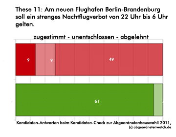 Nachtflugverbot am neuen Großflughafen BBI: Kandidaten-Check-These: Am neuen Flughafen Berlin-Brandenburg soll ein strenges Nachtflugverbot von 22 Uhr bis 6 Uhr gelten. Während die Grünen beinahe geschlossen für ein strenges Nachtflugverbot am neuen Großflughafen eintreten, lehnen dieses drei von vier SPD-Kandidaten ab. Anders als die Direktkandidaten der Grünen vermeidet die Partei in ihrem Wahlprogramm übrigens eine Festlegung in Sachen Nachtflugverbot. Auf Seite 72 heißt es: