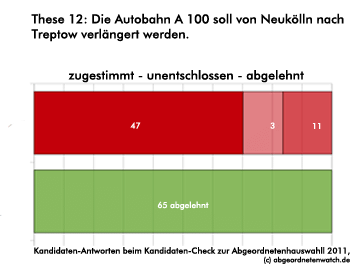 Verlängerung der Autobahn A 100: Kandidaten-Check-These: Die Autobahn A 100 soll von Neukölln nach Treptow verlängert werden. Beim Thema A 100-Verlängerung liegen die Kandidaten beider Parteien weit auseinander. Der Autobahnbau wird von den Grünen geschlossen abgelehnt, auf Seiten der SPD sind drei Viertel der Kandidaten jedoch dafür.
