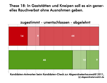 Rauchverbot Kandidaten-Check-These: In Gaststätten und Kneipen soll es ein generelles Rauchverbot ohne Ausnahmen geben. Gegensätzliche Positionen auch beim Thema Rauchverbot: Hier stehen sich bei SPD und Grünen zwei etwa gleich große Gruppen gegenüber. Von den Direktkandidaten der Grünen sprechen sich zwei Drittel für ein generelles Rauchverbot ohne Ausnahmen aus, beinahe ebensoviele SPD-Kandidaten nehmen die gegensätzlich Position eine.
