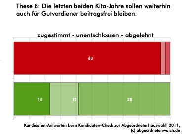 Kita-Gebühren: Kandidaten-Check-These: Die letzten beiden Kita-Jahre sollen weiterhin auch für Gutverdiener beitragsfrei bleiben. Während die SPD-Kandidaten beinahe geschlossen für die beiden kostenlosen Kita-Jahre auch für Gutverdiener plädieren, sieht es die Mehrheit der Grünen ganz anders. Allerdings teilt bei den Grünen jeder Vierte Kandidat die Position der SPD-Kollegen.