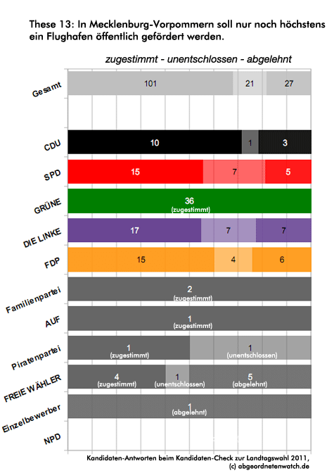 These 13: In Mecklenburg-Vorpommern soll nur noch höchstens ein Flughafen öffentlich gefördert werden. Auch in der Frage „Förderung von Flughäfen“ gibt es innerhalb von SPD und Linke divergierende Meinungen. Jeweils eine knappe Mehrheit der Kandidaten in beiden Parteien stimmt obenstehender These zu, etwa ein Viertel ist gegensätzlicher Meinung, das übrige Viertel ist unentschlossen. Von den Kandidaten der FDP sind 60 Prozent gegen eine öffentliche Förderung von mehr als einem Flughafen, allerdings teilt ein Viertel diese Ansicht nicht.