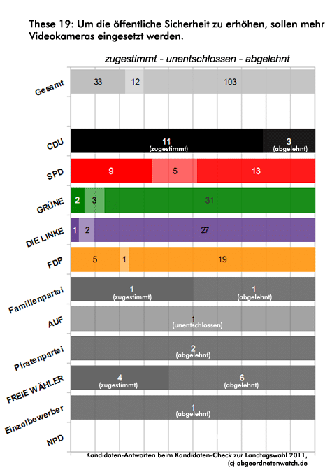 These 19: Um die öffentliche Sicherheit zu erhöhen, sollen mehr Videokameras eingesetzt werden. Während es zu dieser These bei den übrigen Parteien ein relativ eindeutiges Meinungsbild gibt, sind die Positionen der SPD-Kandidaten recht uneinheitlich. Ein Drittel von ihnen spricht sich für den Einsatz von mehr Videokameras aus, etwa die Hälfte vertritt jedoch die gegensätzliche Meinung. Fast jeder fünfte SPD-Kandidat ist in dieser Frage unentschlossen.