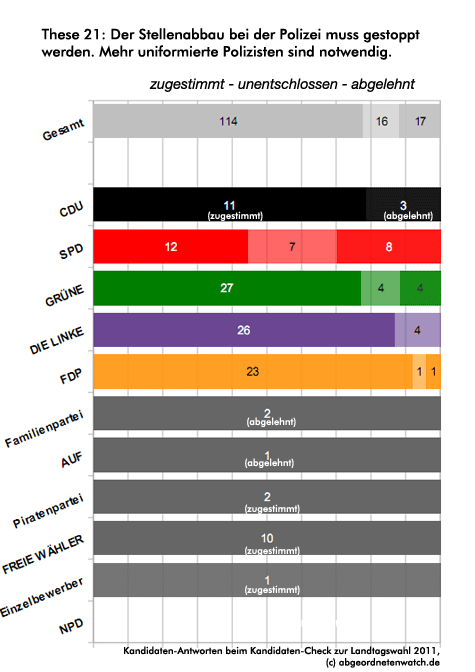 These 21: Der Stellenabbau bei der Polizei muss gestoppt werden. Mehr uniformierte Polizisten sind notwendig. Erneut sind es die Sozialdemokraten, die sich mit ihren Standpunkten von den übrigen Parteien abheben. Während sich die Kandidaten von CDU, FDP, Grüne und Linkspartei mit ziemlich deutlicher absoluter Mehrheit für mehr Polizisten aussprechen, ist die SPD in dieser Frage dreigeteilt: Weniger als die Hälfte der sozialdemokratischen Direktkandidaten ist für eine Aufstockung der Polizisten, gut ein Viertel ist dagegen, knapp ein Drittel unentschlossen.