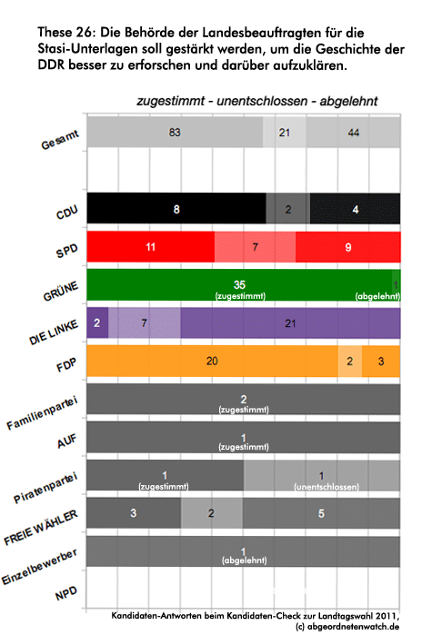 These 26: Die Behörde der Landesbeauftragten für die Stasi-Unterlagen soll gestärkt werden, um die Geschichte der DDR besser zu erforschen und darüber aufzuklären. Bei der Frage nach einer Stärkung der Stasi-Unterlagenbehörde fallen die Antworten der Linken-Kandidaten ins Auge. Als einzige sprechen sie sich mehrheitlich dagegen aus (zu gut drei Vierteln). Lediglich zwei Kandidaten befürworten, dass die Behörde der Landesbeauftragten für die Stasi-Unterlagen gestärkt wird. Bei der SPD gehen die Meinungen am stärksten auseinander. Mehr als ein Drittel der Kandidaten spricht sich für eine Stärkung der Stasi-Behörde aus, ein weiteres Drittel ist dagegen, ein Viertel unentschlossen.