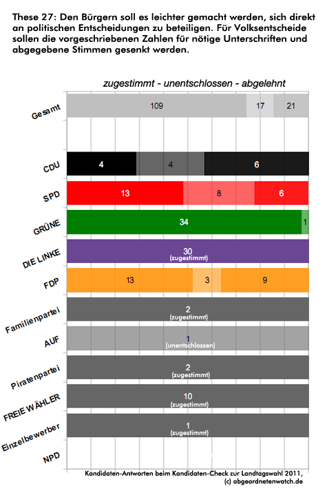 These 27: Den Bürgern soll es leichter gemacht werden, sich direkt an politischen Entscheidungen zu beteiligen. Für Volksentscheide sollen die vorgeschriebenen Zahlen für nötige Unterschriften und abgegebene Stimmen gesenkt werden. Nur Linke und Grüne haben einen einheitlichen Standpunkt zum Thema Beteiligungsquoren bei Volksentscheiden. Mit Ausnahme eines Grünen-Kandidaten sprechen sich beide Parteien für deren Senkung aus. Bei FDP und SPD teilt diese Position zwar ebenfalls eine Mehrheit der Kandidierenden, allerdings ist Gruppe der Gegner von geringeren Quoren in beiden Parteien überraschend groß.