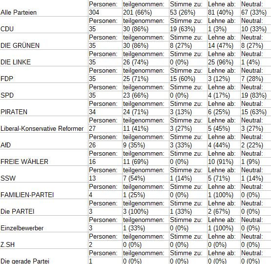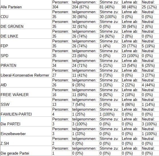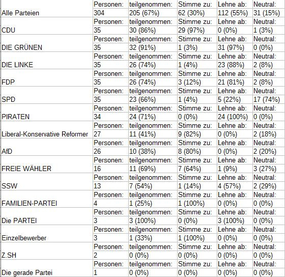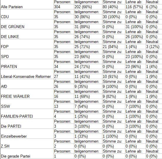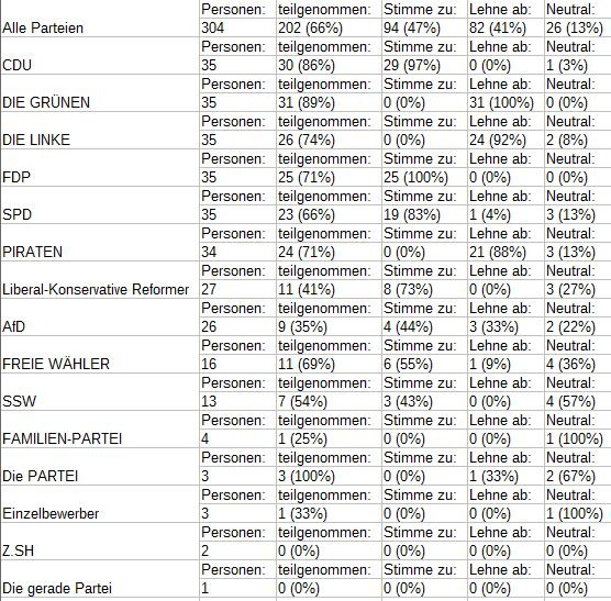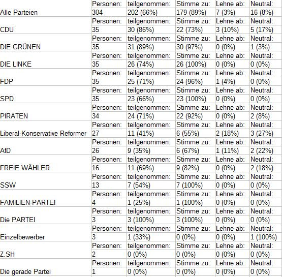 Bisher haben 205 von 304 Politikerinnen und Politiker ihre Standpunkte zu den Thesen mitgeteilt. Alle Positionen samt Begründung sind übrigens auch auf der Profilseite eines Kandidierenden bei abgeordnetenwatch.de zu finden.