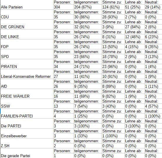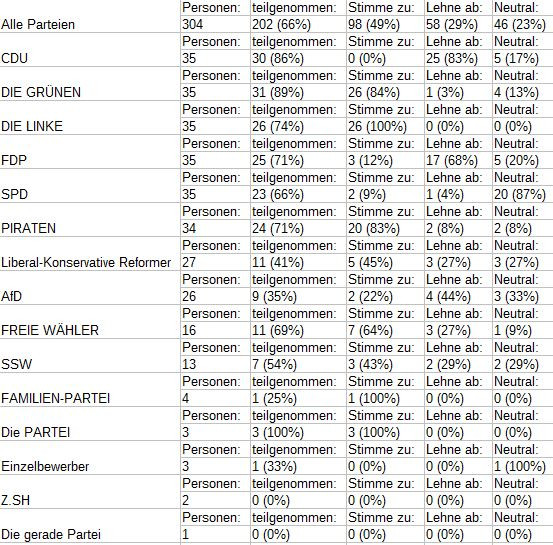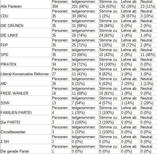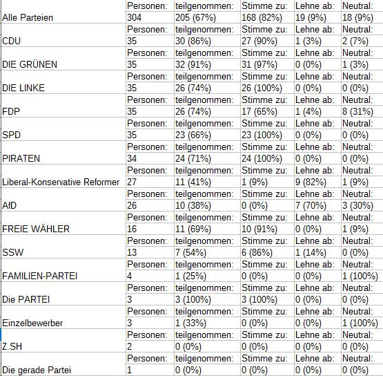 Neben den individuellen Standpunkten der Wahlbewerberinnen und Wahlbewerber ist aber auch das Ergebnis nach Parteien interessant: Wie positionieren sich beispielsweise die Kandidierenden der SPD zu der Frage, ob Politikerinnen und Poliker aus den Gremien des öffentlich-rechtlichen Rundfunks ausgeschlossen werden sollen? Aus welchen Parteien kommen die 19 Kandidierenden, die gegen die Verankerung von Aufklärung über sexuelle Vielfalt im Lehrplan sind? Welche Thesen scheinen innerhalb von CDU oder Grünen besonders umstritten?