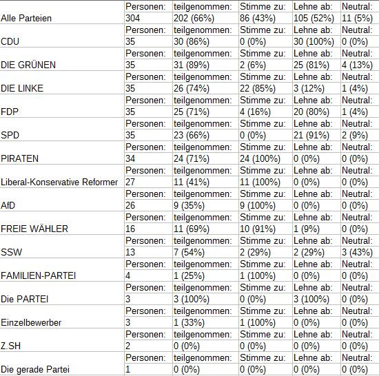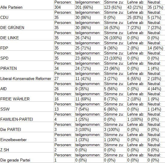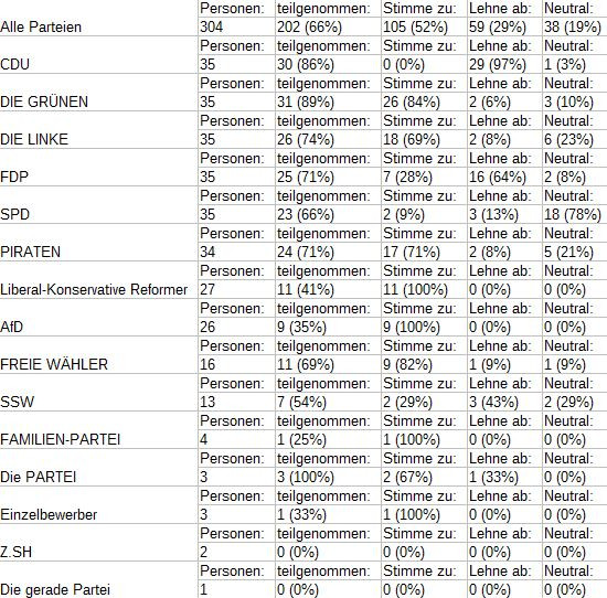 Während sich die Kandidierenden von CDU und AfD geschlossen für Abschiebungen von ausreisepflichtigen Personen nach Afghanistan aussprechen, sind die Wahlbewerberinnen und Wahlbewerber von SPD, Grünen, Linken, SSW einhellig dagegen. Bei den Piraten liegt die Ablehnung bei 96 Prozent.