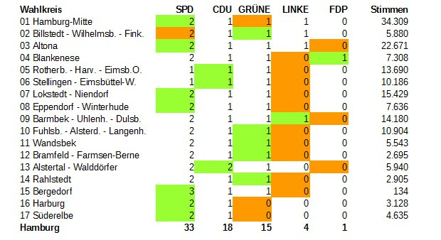 Nachfolgende Tabelle zeigt, wie viele Sitze die Parteien jeweils in den 17 Wahlkreise bekommen werden. Grundlage ist die infratest dimap Umfrage vom 29.1.2015 und die Stimmverteilungen in den Wahlkreisen bei der Bürgerschaftswahl 2011. Lesehilfe: Wenn die orange markierte Partei zusätzlich so viele Stimmen erhält, wie in der Spalte "Stimmen" steht, nimmt sie der Partei, die grün markiert ist, einen Sitz weg. Die anderen Parteien brauchen jeweils mehr zusätzliche Stimmen. Die Zahl der Stimmen geteilt durch fünf ergibt jeweils in etwa die Zahl der erforderlichen Wähler*innen für einen Sitzwechsel.
