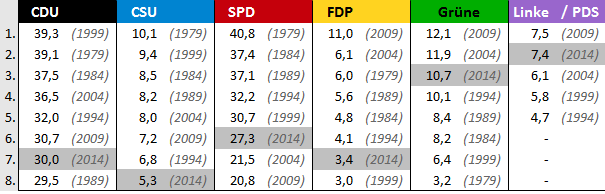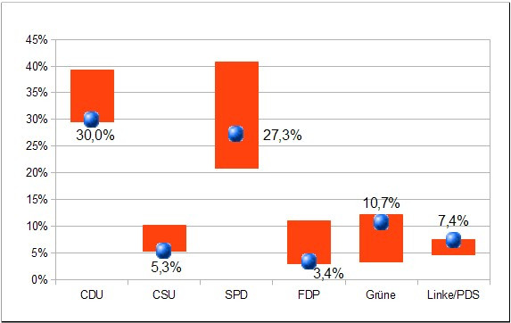 Stellt man die bisherigen Ergebnisse der Parteien grafisch dar, ergibt sich dieses Bild (wobei der orange Balken die Bandbreite der bisherigen Wahlergebnisse anzeigt und der blaue Punkt das Ergebnis bei der Europawahl 2014 markiert):