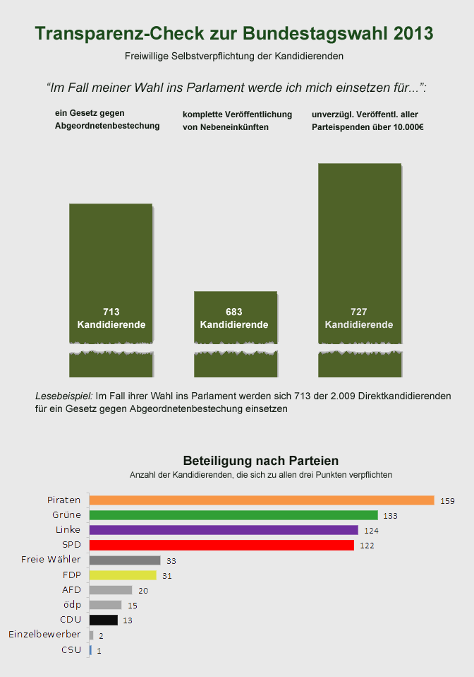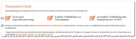 Beim Transparenz-Check handelt es sich um eine freiwillige Selbstverpflichtung, die die Wahlbewerber gegenüber der Öffentlichkeit eingehen. Konkret verpflichten sich die Kandidierenden: