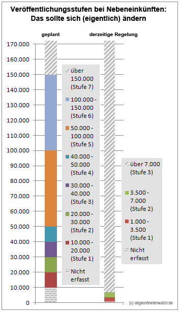 Wer zusätzlich zu seiner Abgeordnetendiät viel verdient, so der Plan, bei dem soll die Öffentlichkeit das auch erfahren. Dies war das Anliegen von SPD, Grünen und Linken, in deren Reihen es traditionell wenige Spitzenverdiener gibt, Karl Lauterbach und Peer Steinbrück einmal ausgenommen. Am Ende verständigten sich Koalition und Opposition darauf, das bisherige Drei-Stufen-Modell durch ein sieben stufiges System mit der Höchststufe 150.000 Euro zu ersetzen (s. rechte Grafik).