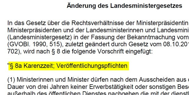Ein solcher Gesetzentwurf liegt dem Innen- und Rechtsausschuss des Landtages tatsächlich vor. Er stammt allerdings nicht von der SPD oder der Regierungskoalition, sondern von den PIRATEN. Die Oppositionsfraktion fordert darin eine Sperrfrist von drei Jahren für Minister, die eine Tätigkeit außerhalb des öffentlichen Dienstes aufnehmen wollen, wenn diese im Zusammenhang mit ihrer politischen Tätigkeit steht. Dadurch solle bereits der Anschein vermieden werden, dass eine im Amt getroffene Entscheidung mit der neuen Tätigkeit im Zusammenhang steht. Eine weitreichende Karenzzeitregelung würde die Glaubwürdigkeit der Politik und das Vertrauen der Bürger stärken, finden die PIRATEN.