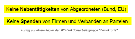 Das Diskussionspapier, das die Arbeitsgruppe „Demokratie“ innerhalb der SPD-Bundestagsfraktion kürzlich verfasst hat und das wir weiter unten veröffentlichen, trägt die Überschrift „Demokratie erneuern, Demokratie leben“. Die Autoren bringen zahlreiche Ideen ins Spiel, darunter Bürgerfragen in der Fragestunde des Deutschen Bundestages oder Volksentscheide auf Bundesebene. Doch besonders zwei Vorschläge stechen hervor: Neben der Abschaffung von Parteispenden ist auch die Rede von einem Verbot von Nebentätigkeiten.