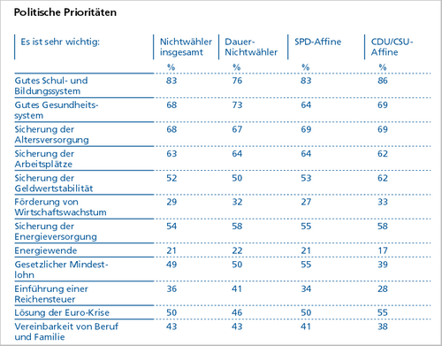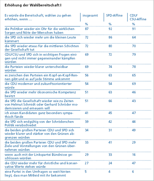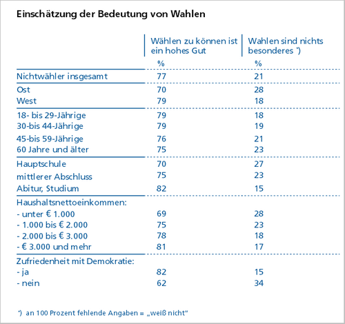 • bei den allermeisten Nichtwählern würde sich die Bereitschaft zur Wahl erhöhen, wenn sich Politiker wieder den Sorgen der "kleinen Leute" annehmen würden (87 Prozent)