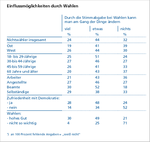 • mehr als zwei Drittel der Nichtwähler meint, dass man durch seine Stimmabgabe "etwas" oder sogar "viel" ändern kann (44 bzw. 24 Prozent).