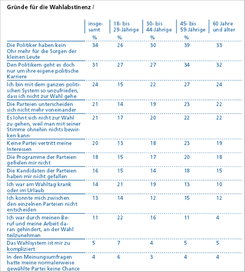 • jeder dritte Nichtwähler bleibt bei Wahlen zu Hause, weil aus seiner Sicht die Politiker "kein Ohr mehr für die Sorgen der kleinen Leute haben" (34 Prozent).