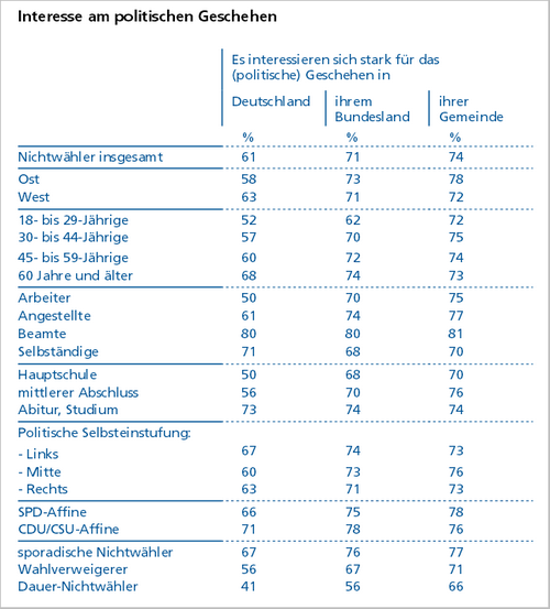 • eine Mehrheit der Nichtwähler interessiert sich stark für das politische Geschehen in Deutschland (61 Prozent), ihrem Bundesland (71 Prozent) und ihrer Gemeinde (74 Prozent)