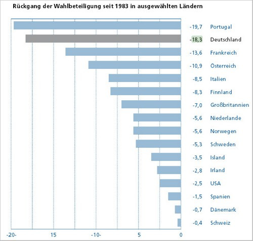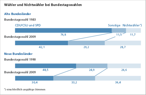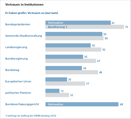• das größte Vertrauen haben die Nichtwähler in ihre Gemeinde- und Stadtverwaltung (53 Prozent). Erst dann folgen mit großem Abstand die Landesregierung (42 Prozent), die Bundesregierung (35 Prozent), der Bundestag (34 Prozent) und die Europäische Union (20 Prozent)