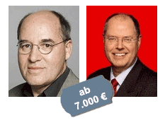 Für all jene, die einen Abgeordneten gerne einmal für einen Vortrag bei ihrer Firmenveranstaltung buchen möchten und sich nun von den Honoraren abgeschreckt fühlen, gibt es auch eine gute Nachricht: Preise sind offenbar verhandelbar. Innenexperte Bosbach tritt auch schon für 1.000 bis 3.500 Euro ("Stufe 1") vor Anwälten und IT-Experten auf, ebenso Fraktionschef Gysi, der vor der Loge Royal York Z. FRDD.I.L und dem Verlag für die Deutsche Wirtschaft zum Vorzugspreis redete. Und auch Peer Steinbrück ist im Zweifel günstiger zu haben. Bei der Vereinigung der Unternehmensverbände in Hamburg und Schleswig-Holstein trat er 2010 für gerade einmal 3.500 bis 7.000 Euro ans Rednerpult.