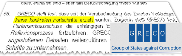 Und so wird GRECO in ihrem demnächst erscheinenden Umsetzungsbericht wohl erneut "starke Bedenken wegen der sehr begrenzten Aufmerksamkeit, die einige Empfehlungen zu Fragen von hoher Wichtigkeit erfahren haben" äußern - und die Regierungskoalition wird diese Rüge erneut ignorieren.