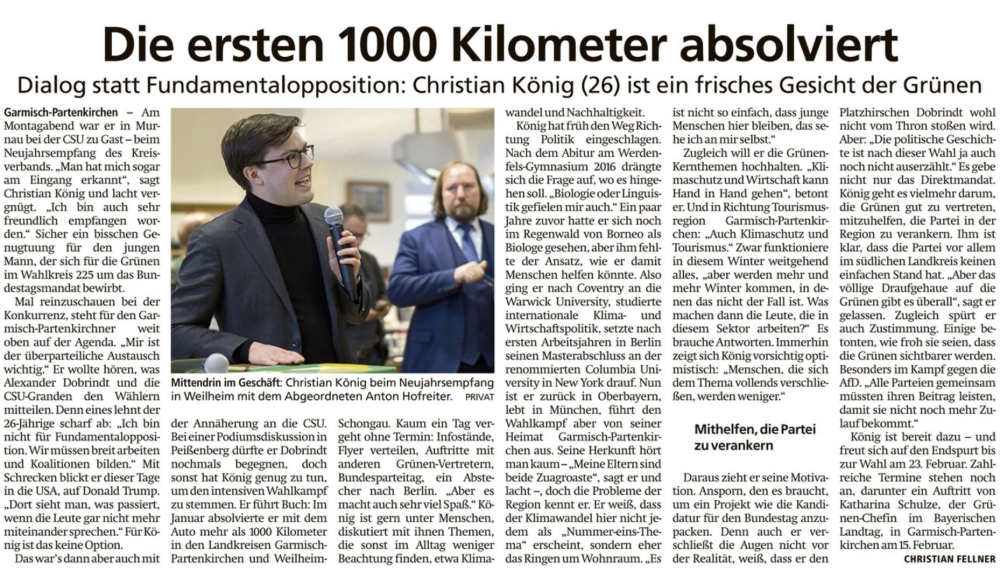 Im Oberland rund um Garmisch-Partenkirchen bin ich aufgewachsen. Verwurzelt in unserer schönen Heimat hatte ich nach dem Abitur am Werdenfels-Gymnasium die Chance, internationale Klima- und Wirtschaftspolitik in den USA und England zu studieren. Dadurch konnte ich meine Leidenschaft für politischen und gesellschaftlichen Fortschritt zu meinem Beruf machen. Als Direktkandidat für den Wahlkreis 225 Weilheim & Garmisch-Partenkirchen trete ich für die zeitgemäße Politik ein, die das Oberland verdient hat.