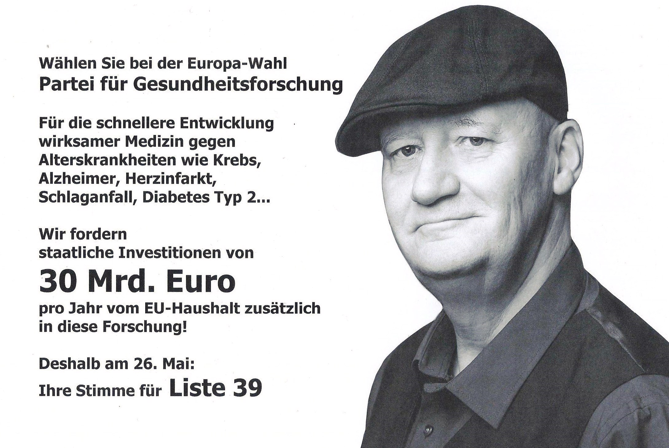 Wie wichtig die Gesundheit ist sieht man nicht zuletzt daran, dass es zwar Tausende von Krankheiten gibt, aber eben nur EINE Gesundheit. Ich selber bin Krebspatient, leide an einer koronaren Herzerkrankung und bin Typ 2-Diabetiker. Schon aus dieser gesundheitlichen Betroffenheit heraus hat die Gesundheitsforschung und die Entwicklung wirksamer Medizin gegen diese Krankheiten einen hohen persönlichen Stellenwert für mich. Weil die Entscheidungen über den Forschungsetat in den jeweiligen Parlamenten getroffen werden, sehe ich hier eine wichtige politische Handlungebene. Man kann nur etwas erreichen, wenn man sich dafür einsetzt. Das tue ich mit und in der Partei für Gesundheitsforschung.