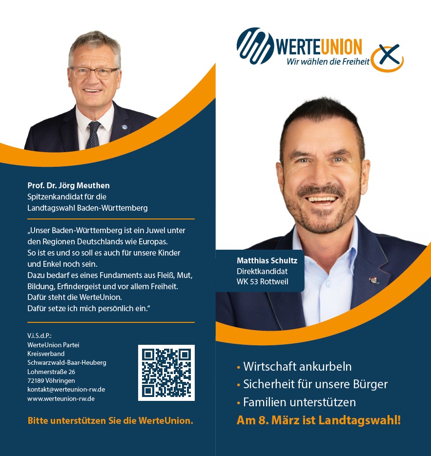 Matthias Schultz, Jahrgang 1966, geb. in Fürth (Bay), seit 1979 heimisch in Baden-Württemberg. Überzeugter Christ. Selbstständiger Kaufmann im Bereich Finanzen und Immobilien seit 1988. In dieser Zeit habe ich alle Facetten des Lebens kennengelernt und verstehe daher die aktuellen Sorgen und Probleme der deutschen Bürger und Unternehmer sehr gut. Am 16. September 2024, habe ich mich auf Anraten eines Freundes  entschlossen, nicht nur mit der aktuellen gottlosen Politik zu hadern, sondern mich u. a. für meine zukünftigen Enkelkinder in der Politik einzusetzen. Als Basis erschien mir eine neue Partei, die WerteUnion, welche 2024 aus der CDU heraus entstanden ist, als geeignet. Sie steht für christlich-freiheitlich-konservative Werte, mit vernünftiger, pragmatischer Politik ohne Ideologie, in allen Bereichen. Der letztendliche Ausschlag war für mich sicherlich das Familienprogramm der Partei, das sich in einer solchen Klarheit und mit einem Bekenntnis zu christlichen Werten bekennt, wie das keiner anderen Partei. Denn wir wollen auch keine ideologisch geprägte Familienpolitik. Es ist mein erklärtes Ziel, mich für eine notwendige Politikwende im Ländle einzusetzen. Lassen Sie uns gemeinsam an einem besseren Deutschland arbeiten.