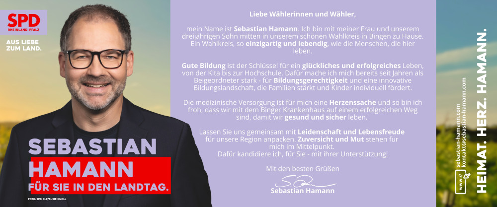 mein Name ist Sebastian Hamann. Ich bin mit meiner Frau und unserem dreijährigen Sohn mitten in unserem schönen Wahlkreis in Bingen zu Hause.