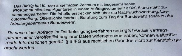 Dass wir dann rund zwei Monate lang nichts mehr in der Angelegenheit hörten, hatte einen einfachen Grund: Hinter den Kulissen erkundigte sich das Ministerium bei den Agenturen, ob diese einer Weitergabe der von uns erbetenen Informationen zustimmten. Dabei holten sich die Beamten von den betroffenen PR-Agenturen eine Abfuhr ein, wie wir jetzt aus einem Schreiben des Verteidigungsministeriums erfahren haben.