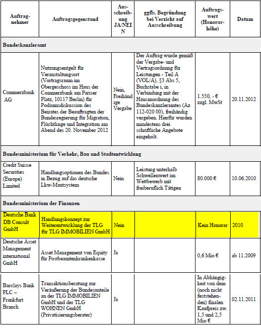 In ihrer 34seitigen Antwort listet die Bundesregierung außerdem die öffentlichen Aufträge auf, die die genannten Banken in dieser Wahlperiode erhalten haben. Ins Auge fällt dabei ein Dienstleistung, die 2010 von der DB Consult GmbH erbracht wurde - und zwar ohne Honorar. Im Auftrag des Finanzministeriums erstellte die Deutsche Bank-Tochter seinerzeit ein Handlungskonzept "zur Weiterentwicklung" des Immobilienunternehmens TLG , das sich damals im Besitz des Bundes befand. Im Dezember 2012 verkaufte der Bund das Unternehmen für 1,1 Mrd. Euro an den US-amerikanischen Finanzinvestor Lone Star, dabei handelte es sich um die "größte Unternehmensprivatisierung seit fünf Jahren". Die Gratis-Dienstleistung der Deutsche Bank-Tochter ist um so erstaunlicher als dass die Barcleys Bank, die den Bund bei der Privatisierung der Immobilienfirma beriet, 2011 ein Honorar in Millionenhöhe kassierte.